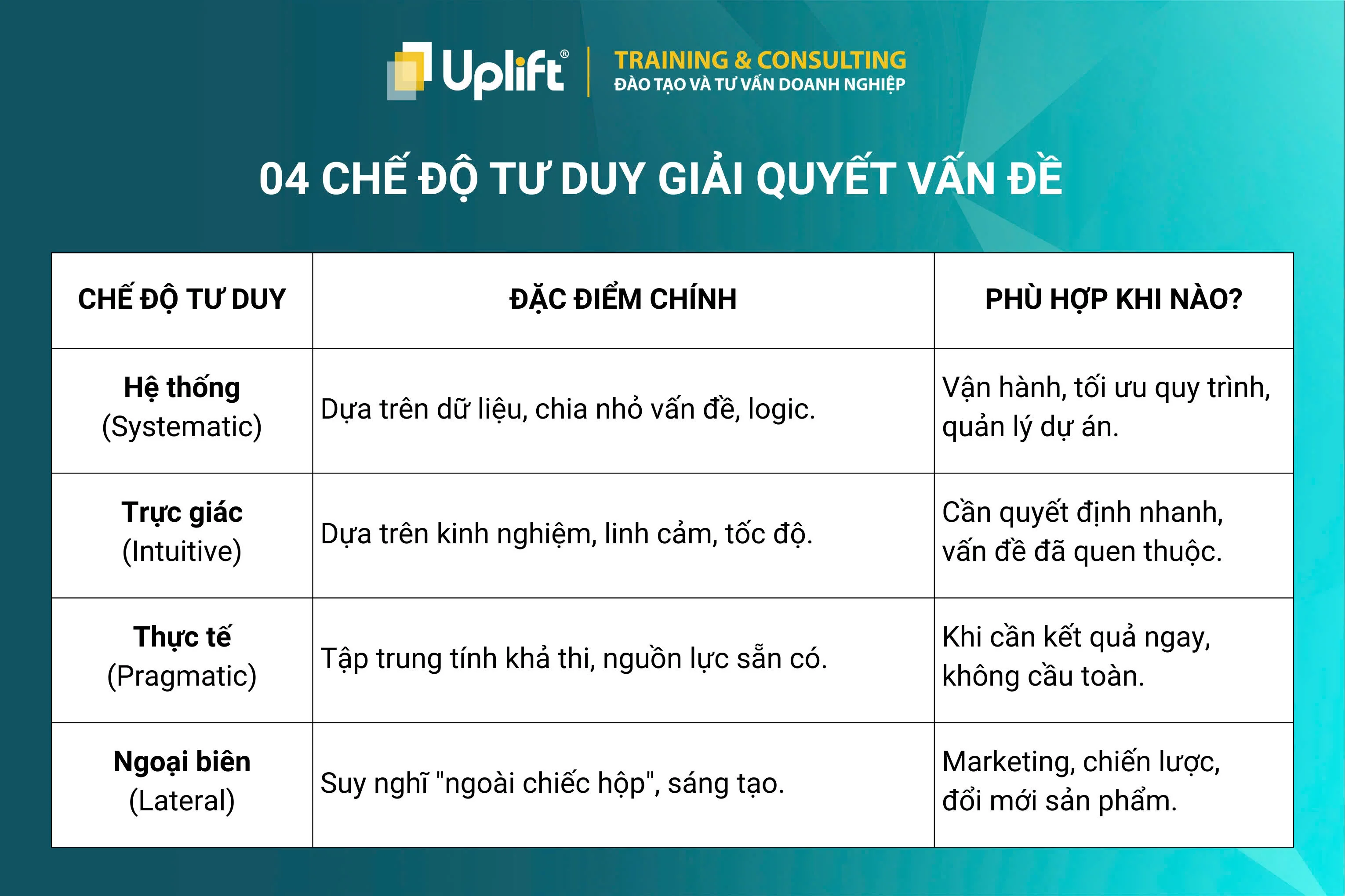 Dưới đây là bảng tổng hợp 04 chế độ tư duy giúp tiếp cận và giải quyết vấn đề hiệu quả.
