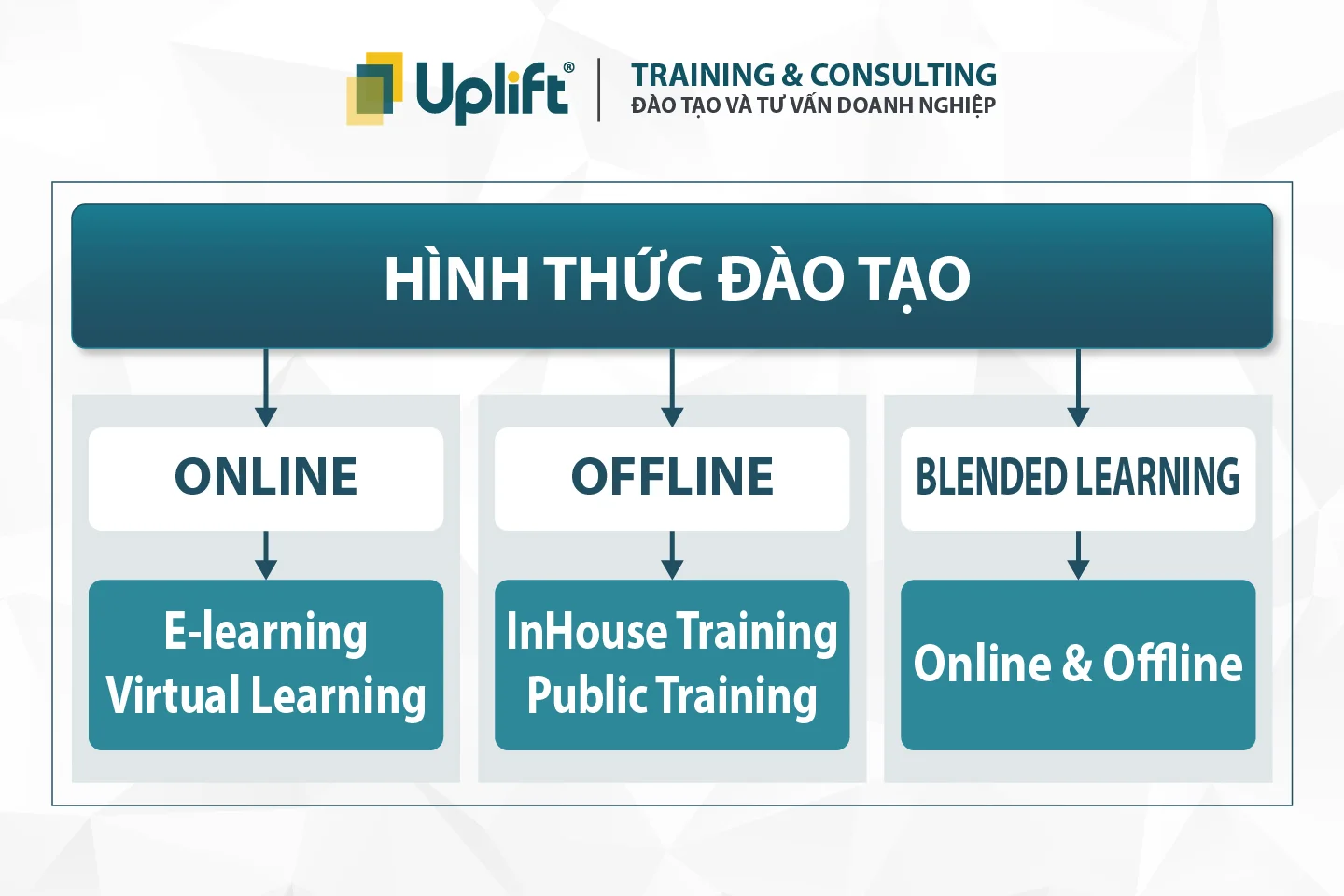 Công ty đào tạo UPLIFT ứng dụng Blended Learning như một hệ sinh thái đào tạo và học tập liên tục, chủ động, hướng đến ứng dụng thực tiễn trong phát triển năng lực và sự nghiệp.