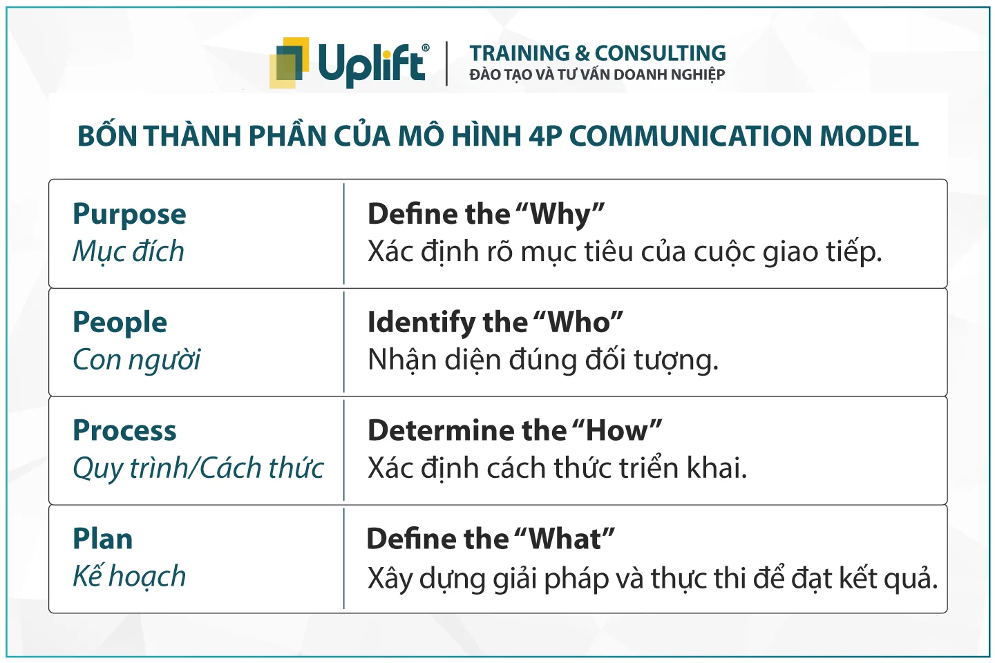 Trong bài viết này, công ty đào tạo UPLIFT sẽ giới thiệu Mô hình 4P Communication giúp Anh/Chị: